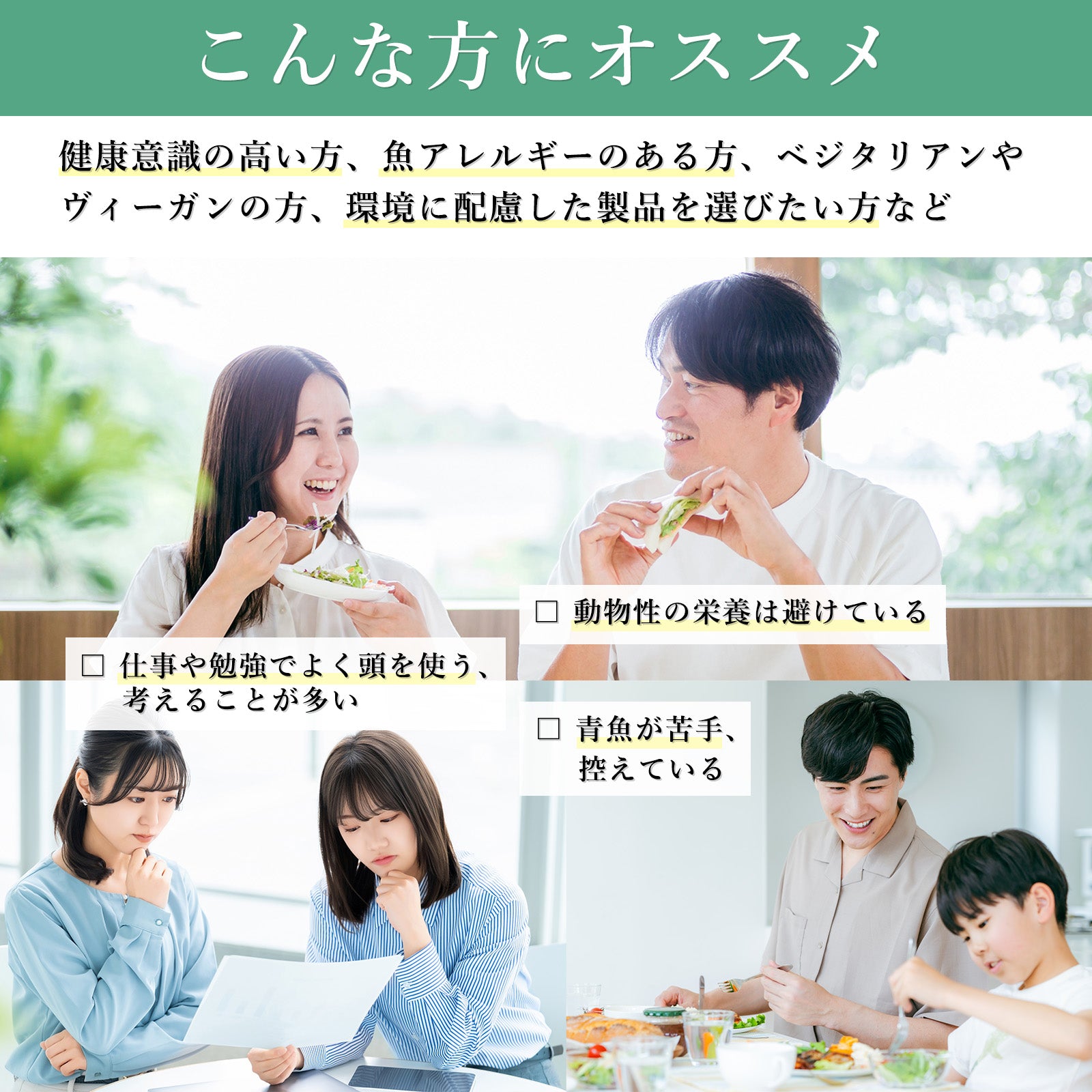 海産魚を原料とした従来のオメガ3製品と異なり、環境負荷が少なく、魚特有のにおいも気になりません。